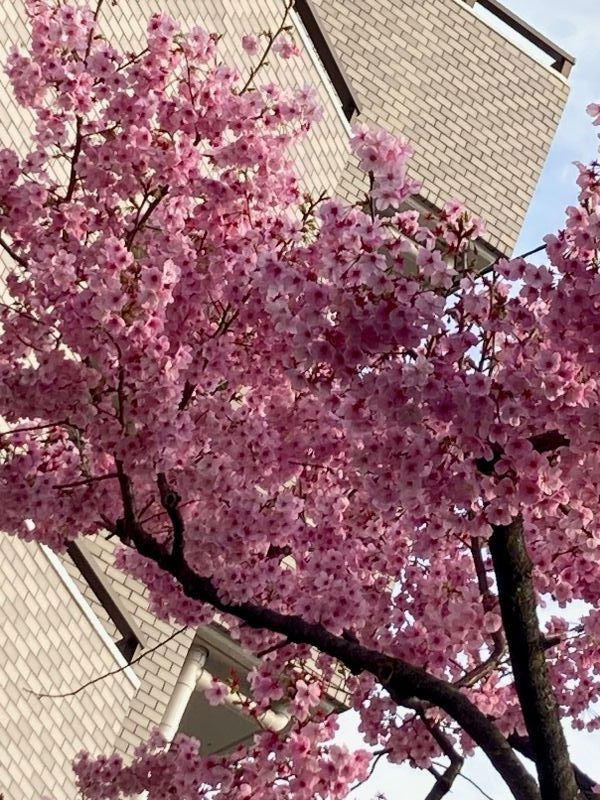 車窓から見た濃いピンクの桜。陽光桜かな?